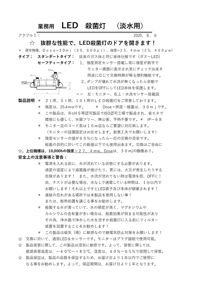 従来のガス体の殺菌蛍光管を搭載した殺菌灯は、殆どの方はまだ、ブルーに光っているから効いているだろうと思い込んでいるだけでの方々が多いのはお解りだと思いますので、アクアルミでは、ご使用目的の殺菌に於いて、どれだけの強度以上を維持出来れば殺菌が出来ているか?の確認を センサーで常にモニターで強度表示し解るようにしておりますので、目的別にそれ以下の強度に下がったら殺菌灯のLEDの所の交換をお勧め致しております。ガス体と比べて、LED素子の特質性にて、省エネ、長期使用を可能にし経済的にも優れております! 抜群な性能でお応えいたします!何卒、宜しくお願い申し上げます。